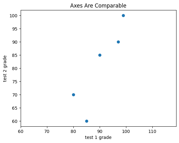 test_1_grades = [99, 90, 85, 97, 80]test_2_grades = [100, 85, 60, 90, 70]plt.scatter(test_1_grades, test_2_grades)plt.title("Axes Are Comparable")plt.axis("equal")plt.xlabel("test 1 grade")plt.ylabel("test 2 grade")# save the plot as a PNG fileplt.savefig('im/viz_scatterplot_axes_comparable.png')plt.show()