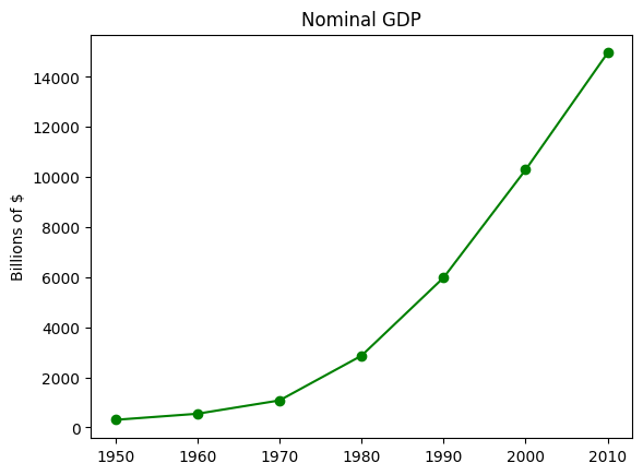 import matplotlib.pyplot as pltyears = [1950, 1960, 1970, 1980, 1990, 2000, 2010]gdp = [300.2, 543.3, 1075.9, 2862.5, 5979.6, 10289.7, 14958.3]# create a line chart, years on x-axis, gdp on y-axisplt.plot(years, gdp, color='green', marker='o', linestyle='solid')# add a titleplt.title("Nominal GDP")# add a label to the y-axisplt.ylabel("Billions of $")# save the plot as a PNG fileplt.savefig('im/viz_gdp.png')plt.show()