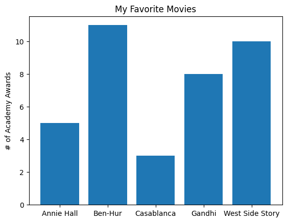 movies = ["Annie Hall", "Ben-Hur", "Casablanca", "Gandhi", "West Side Story"]num_oscars = [5, 11, 3, 8, 10]# plot bars with left x-coordinates [0, 1, 2, 3, 4], heights [num_oscars]plt.bar(range(len(movies)), num_oscars)plt.title("My Favorite Movies") # add a titleplt.ylabel("# of Academy Awards") # label the y-axis# label x-axis with movie names at bar centersplt.xticks(range(len(movies)), movies)# save the plot as a PNG fileplt.savefig('im/viz_movies.png')plt.show()