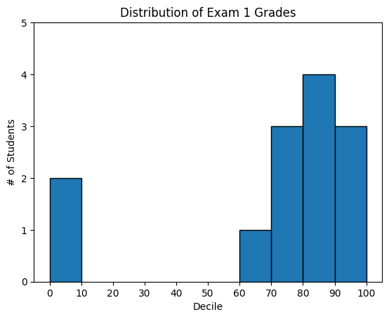 from collections import Countergrades = [83, 95, 91, 87, 70, 0, 85, 82, 100, 67, 73, 77, 0]# Bucket grades by decile, but put 100 in with the 90shistogram = Counter(min(grade //10*10, 90) for grade in grades)plt.bar([x +5for x in histogram.keys()], # Shift bars right by 5list(histogram.values()), # Give each bar its correct height10, # Give each bar a width of 8 edgecolor=(0, 0, 0)) # Black edges for each barplt.axis((-5, 105, 0, 5)) # x-axis from -5 to 105,# y-axis from 0 to 5plt.xticks([10* i for i inrange(11)]) # x-axis labels at 0, 10, ..., 100plt.xlabel("Decile")plt.ylabel("# of Students")plt.title("Distribution of Exam 1 Grades")# save the plot as a PNG fileplt.savefig('im/viz_grades.png')plt.show()