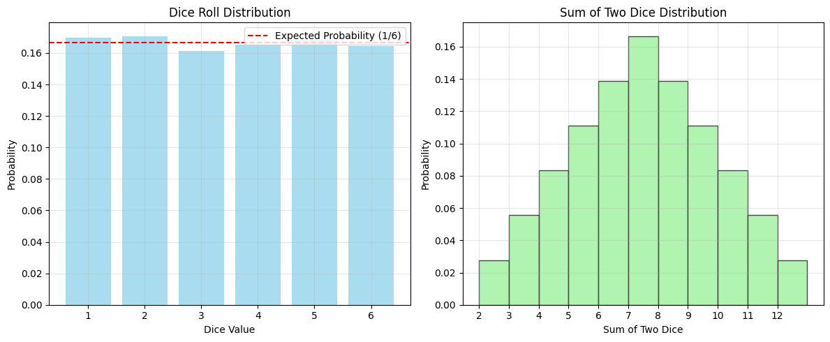 # Dice rolling example - multiple eventsn_rolls =10000dice_rolls = np.random.randint(1, 7, n_rolls)# Calculate various probabilitiesprob_even = np.sum(dice_rolls %2==0) / n_rollsprob_greater_4 = np.sum(dice_rolls >4) / n_rollsprob_1_or_6 = np.sum((dice_rolls ==1) | (dice_rolls ==6)) / n_rollsprint("Dice Rolling Simulation:")print(f"Number of rolls: {n_rolls}")print(f"P(Even number): {prob_even:.3f} (Expected: 0.500)")print(f"P(> 4): {prob_greater_4:.3f} (Expected: 0.333)")print(f"P(1 or 6): {prob_1_or_6:.3f} (Expected: 0.333)")# Visualize dice roll distributionplt.figure(figsize=(12, 5))plt.subplot(1, 2, 1)values, counts = np.unique(dice_rolls, return_counts=True)plt.bar(values, counts/n_rolls, alpha=0.7, color='skyblue')plt.axhline(y=1/6, color='red', linestyle='--', label='Expected Probability (1/6)')plt.xlabel('Dice Value')plt.ylabel('Probability')plt.title('Dice Roll Distribution')plt.legend()plt.grid(True, alpha=0.3)plt.subplot(1, 2, 2)two_dice = []for i inrange(1, 7):for j inrange(1, 7): two_dice.append(i + j)plt.hist(two_dice, bins=range(2, 14), density=True, alpha=0.7, color='lightgreen', edgecolor='black')plt.xlabel('Sum of Two Dice')plt.ylabel('Probability')plt.title('Sum of Two Dice Distribution')plt.xticks(range(2, 13))plt.grid(True, alpha=0.3)plt.tight_layout()plt.savefig('im/dice_probability.png', dpi=150, bbox_inches='tight')plt.show()# Calculate P(sum = 7)sum_7_count =len([x for x in two_dice if x ==7])prob_sum_7 = sum_7_count /len(two_dice)print(f"\nP(Sum = 7 with two dice): {prob_sum_7:.3f}")