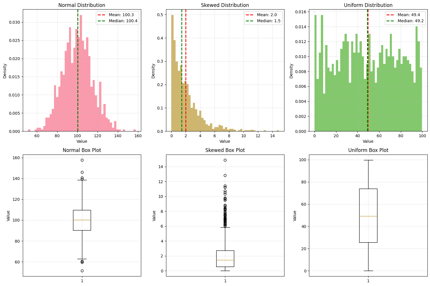 # Generate sample datasets for statistical analysisnp.random.seed(42)# Create different types of distributionsnormal_data = np.random.normal(100, 15, 1000) # Mean=100, std=15skewed_data = np.random.exponential(2, 1000) # Exponential distributionuniform_data = np.random.uniform(0, 100, 1000) # Uniform distribution# Create a DataFramedf = pd.DataFrame({'Normal': normal_data,'Skewed': skewed_data,'Uniform': uniform_data})print("Descriptive Statistics Summary:")print("="*50)print(df.describe())# Calculate additional statisticsprint("\nAdditional Statistics:")print("="*30)for col in df.columns: data = df[col]print(f"\n{col} Distribution:")print(f" Median: {np.median(data):.2f}")print(f" Mode: {stats.mode(data)[0]:.2f}")print(f" Variance: {np.var(data, ddof=1):.2f}")print(f" Skewness: {stats.skew(data):.2f}")print(f" Kurtosis: {stats.kurtosis(data):.2f}")print(f" IQR: {np.percentile(data, 75) - np.percentile(data, 25):.2f}")