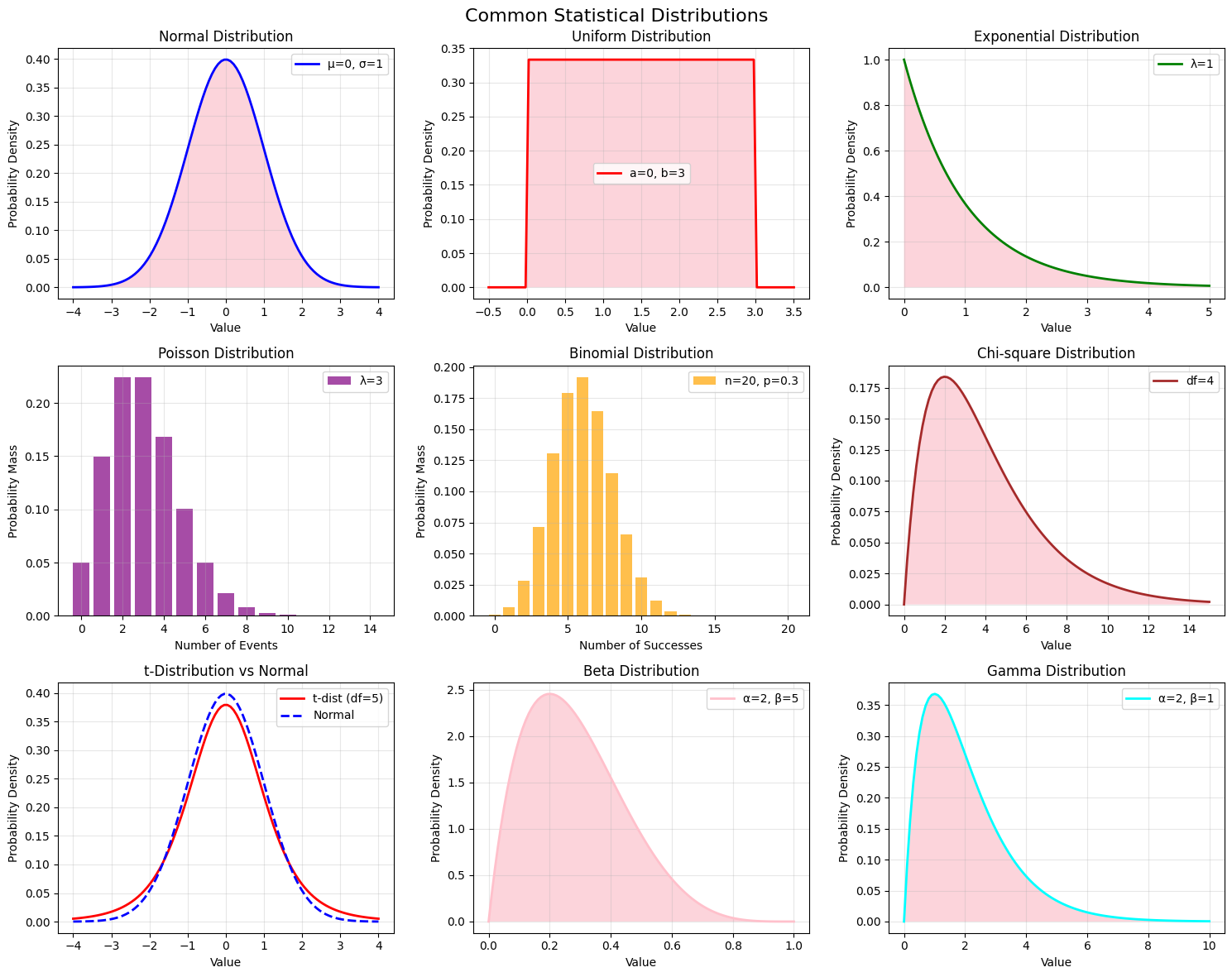 Statistical distributions are mathematical functions that describe the probability of different outcomes in a dataset. Understanding common distributions is crucial for data analysis and modeling.