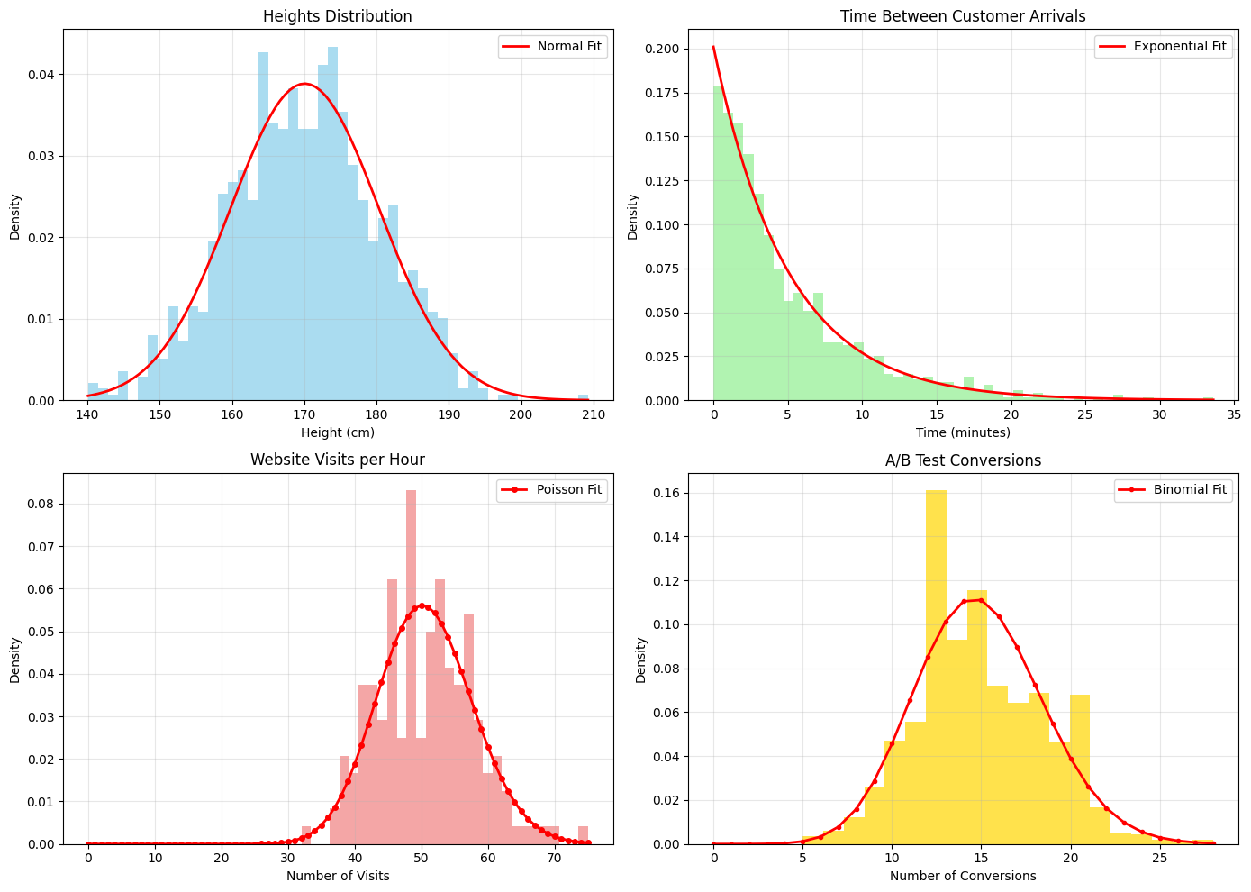 # Real-world applications of distributions with simulated dataprint("Distribution Applications in Data Science:")print("="*50)# 1. Normal Distribution - Height dataheights = np.random.normal(170, 10, 1000) # Heights in cmprint(f"Height Data (Normal Distribution):")print(f" Mean height: {np.mean(heights):.1f} cm")print(f" Std deviation: {np.std(heights):.1f} cm")print(f" % between 160-180 cm: {np.sum((heights >=160) & (heights <=180))/len(heights)*100:.1f}%")# 2. Exponential Distribution - Time between customer arrivalsarrival_times = np.random.exponential(5, 1000) # Average 5 minutes between arrivalsprint(f"\nCustomer Arrival Times (Exponential Distribution):")print(f" Average time between arrivals: {np.mean(arrival_times):.1f} minutes")print(f" % of arrivals within 2 minutes: {np.sum(arrival_times <=2)/len(arrival_times)*100:.1f}%")# 3. Poisson Distribution - Number of website visits per hourvisits_per_hour = np.random.poisson(50, 24*7) # 50 average visits per hour for a weekprint(f"\nWebsite Visits (Poisson Distribution):")print(f" Average visits per hour: {np.mean(visits_per_hour):.1f}")print(f" Max visits in an hour: {np.max(visits_per_hour)}")print(f" Hours with >60 visits: {np.sum(visits_per_hour >60)}")# 4. Binomial Distribution - A/B Testing# 100 users, 15% conversion rateconversions = np.random.binomial(100, 0.15, 1000) # 1000 experimentsprint(f"\nA/B Test Conversions (Binomial Distribution):")print(f" Average conversions per 100 users: {np.mean(conversions):.1f}")print(f" 95% confidence interval: [{np.percentile(conversions, 2.5):.0f}, {np.percentile(conversions, 97.5):.0f}]")# Visualize these applicationsfig, axes = plt.subplots(2, 2, figsize=(14, 10))# Heightsaxes[0, 0].hist(heights, bins=50, density=True, alpha=0.7, color='skyblue')x_heights = np.linspace(heights.min(), heights.max(), 100)axes[0, 0].plot(x_heights, stats.norm.pdf(x_heights, np.mean(heights), np.std(heights)), 'r-', linewidth=2, label='Normal Fit')axes[0, 0].set_title('Heights Distribution')axes[0, 0].set_xlabel('Height (cm)')axes[0, 0].set_ylabel('Density')axes[0, 0].legend()axes[0, 0].grid(True, alpha=0.3)# Arrival timesaxes[0, 1].hist(arrival_times, bins=50, density=True, alpha=0.7, color='lightgreen')x_arrivals = np.linspace(0, arrival_times.max(), 100)axes[0, 1].plot(x_arrivals, stats.expon.pdf(x_arrivals, scale=np.mean(arrival_times)), 'r-', linewidth=2, label='Exponential Fit')axes[0, 1].set_title('Time Between Customer Arrivals')axes[0, 1].set_xlabel('Time (minutes)')axes[0, 1].set_ylabel('Density')axes[0, 1].legend()axes[0, 1].grid(True, alpha=0.3)# Website visitsx_visits = np.arange(0, visits_per_hour.max()+1)axes[1, 0].hist(visits_per_hour, bins=30, density=True, alpha=0.7, color='lightcoral')axes[1, 0].plot(x_visits, stats.poisson.pmf(x_visits, np.mean(visits_per_hour)), 'ro-', linewidth=2, markersize=4, label='Poisson Fit')axes[1, 0].set_title('Website Visits per Hour')axes[1, 0].set_xlabel('Number of Visits')axes[1, 0].set_ylabel('Density')axes[1, 0].legend()axes[1, 0].grid(True, alpha=0.3)# Conversionsx_conv = np.arange(0, conversions.max()+1)axes[1, 1].hist(conversions, bins=20, density=True, alpha=0.7, color='gold')axes[1, 1].plot(x_conv, stats.binom.pmf(x_conv, 100, np.mean(conversions)/100), 'ro-', linewidth=2, markersize=3, label='Binomial Fit')axes[1, 1].set_title('A/B Test Conversions')axes[1, 1].set_xlabel('Number of Conversions')axes[1, 1].set_ylabel('Density')axes[1, 1].legend()axes[1, 1].grid(True, alpha=0.3)plt.tight_layout()plt.savefig('im/distribution_applications.png', dpi=150, bbox_inches='tight')plt.show()