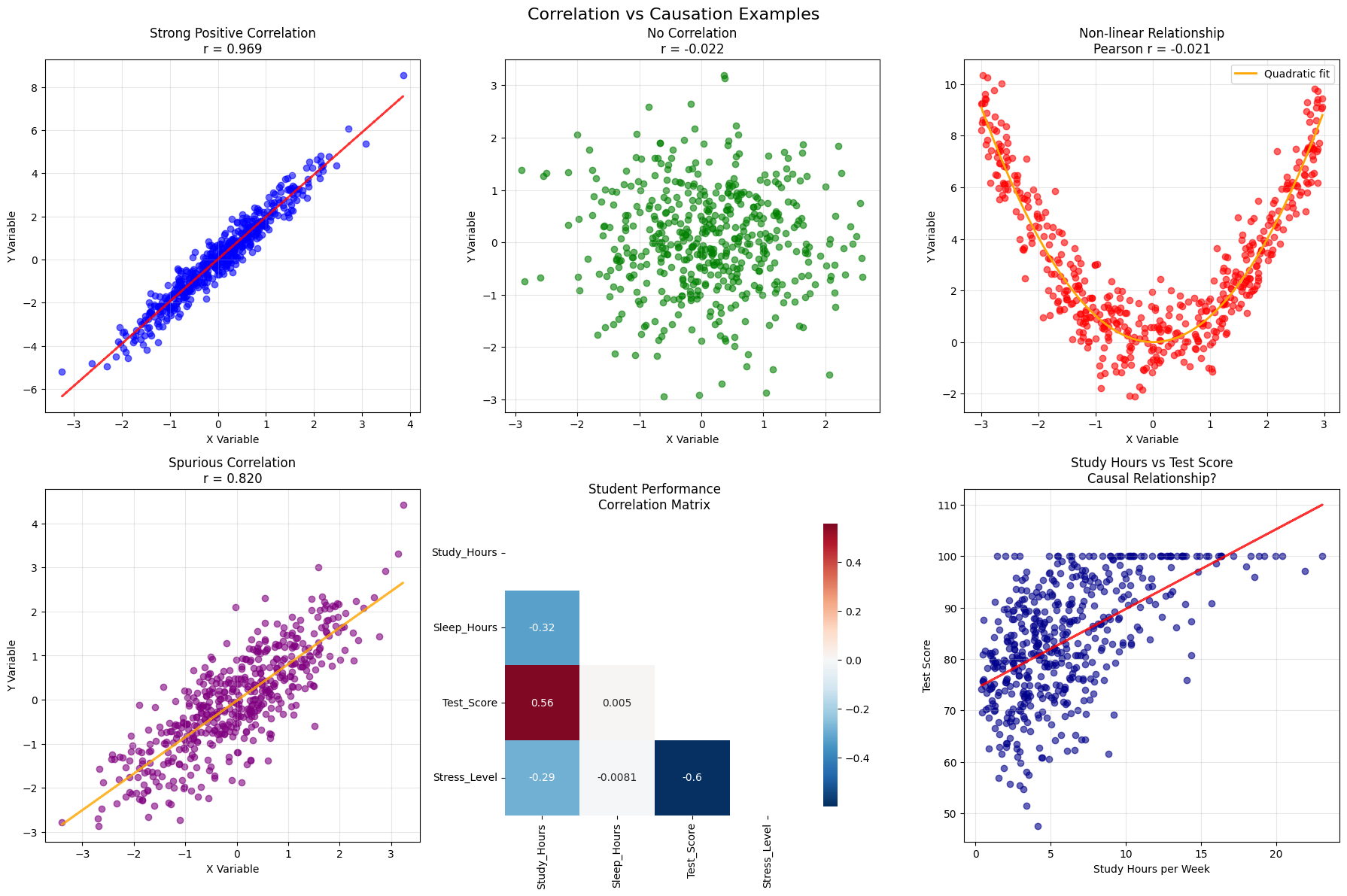 Types of Relationships: 1. No relationship: Variables are independent 2. Linear relationship: Variables change at a constant rate 3. Non-linear relationship: Variables are related but not linearly 4. Spurious correlation: Variables appear related due to confounding factors