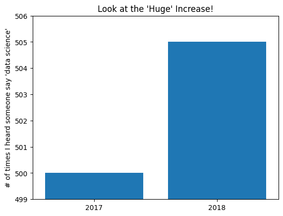 mentions = [500, 505]years = [2017, 2018]plt.bar(years, mentions, 0.8)plt.xticks(years)plt.ylabel("# of times I heard someone say 'data science'")# if you don't do this, matplotlib will label the x-axis 0, 1# and then add a +2.013e3 off in the corner (bad matplotlib!)plt.ticklabel_format(useOffset=False)# misleading y-axis only shows the part above 500plt.axis((2016.5, 2018.5, 499, 506))plt.title("Look at the 'Huge' Increase!")# save the plot as a PNG fileplt.savefig('im/viz_misleading_y_axis.png')plt.show()