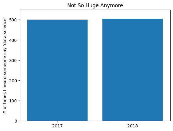 plt.bar(years, mentions, 0.8)plt.xticks(years)plt.ylabel("# of times I heard someone say 'data science'")plt.ticklabel_format(useOffset=False)plt.axis((2016.5, 2018.5, 0, 550))plt.title("Not So Huge Anymore")# save the plot as a PNG fileplt.savefig('im/viz_non_misleading_y_axis.png')plt.show()