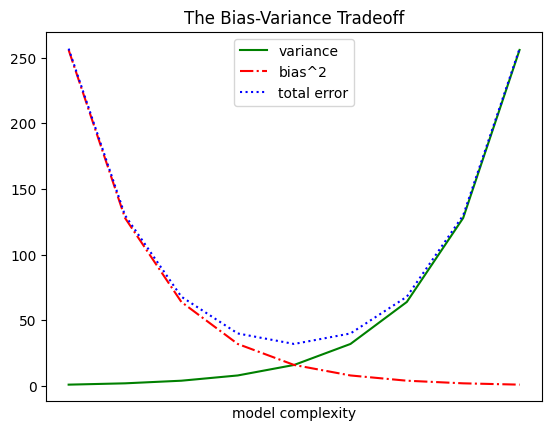variance = [1, 2, 4, 8, 16, 32, 64, 128, 256]bias_squared = [256, 128, 64, 32, 16, 8, 4, 2, 1]total_error = [x + y for x, y inzip(variance, bias_squared)]xs = [i for i, _ inenumerate(variance)]# We can make multiple calls to plt.plot# to show multiple series on the same chartplt.plot(xs, variance, 'g-', label='variance') # green solid lineplt.plot(xs, bias_squared, 'r-.', label='bias^2') # red dot-dashed lineplt.plot(xs, total_error, 'b:', label='total error') # blue dotted line# Because we've assigned labels to each series,# we can get a legend for free (loc=9 means "top center")plt.legend(loc=9)plt.xlabel("model complexity")plt.xticks([])plt.title("The Bias-Variance Tradeoff")# save the plot as a PNG fileplt.savefig('im/viz_line_chart.png')plt.show()