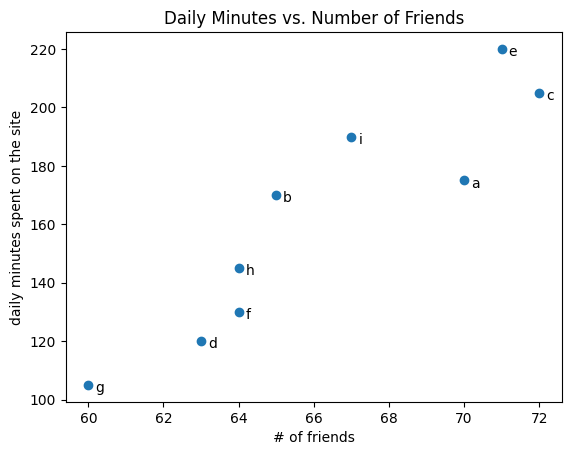 friends = [ 70, 65, 72, 63, 71, 64, 60, 64, 67]minutes = [175, 170, 205, 120, 220, 130, 105, 145, 190]labels = ['a', 'b', 'c', 'd', 'e', 'f', 'g', 'h', 'i']plt.scatter(friends, minutes)# label each pointfor label, friend_count, minute_count inzip(labels, friends, minutes): plt.annotate(label, xy=(friend_count, minute_count), # Put the label with its point xytext=(5, -5), # but slightly offset textcoords='offset points')plt.title("Daily Minutes vs. Number of Friends")plt.xlabel("# of friends")plt.ylabel("daily minutes spent on the site")# save the plot as a PNG fileplt.savefig('im/viz_scatterplot.png')plt.show()
