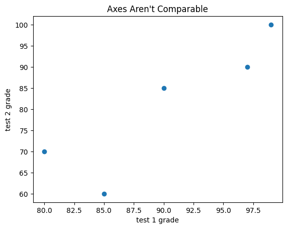 test_1_grades = [ 99, 90, 85, 97, 80]test_2_grades = [100, 85, 60, 90, 70]plt.scatter(test_1_grades, test_2_grades)plt.title("Axes Aren't Comparable")plt.xlabel("test 1 grade")plt.ylabel("test 2 grade")# save the plot as a PNG fileplt.savefig('im/viz_scatterplot_axes_not_comparable.png')plt.show()